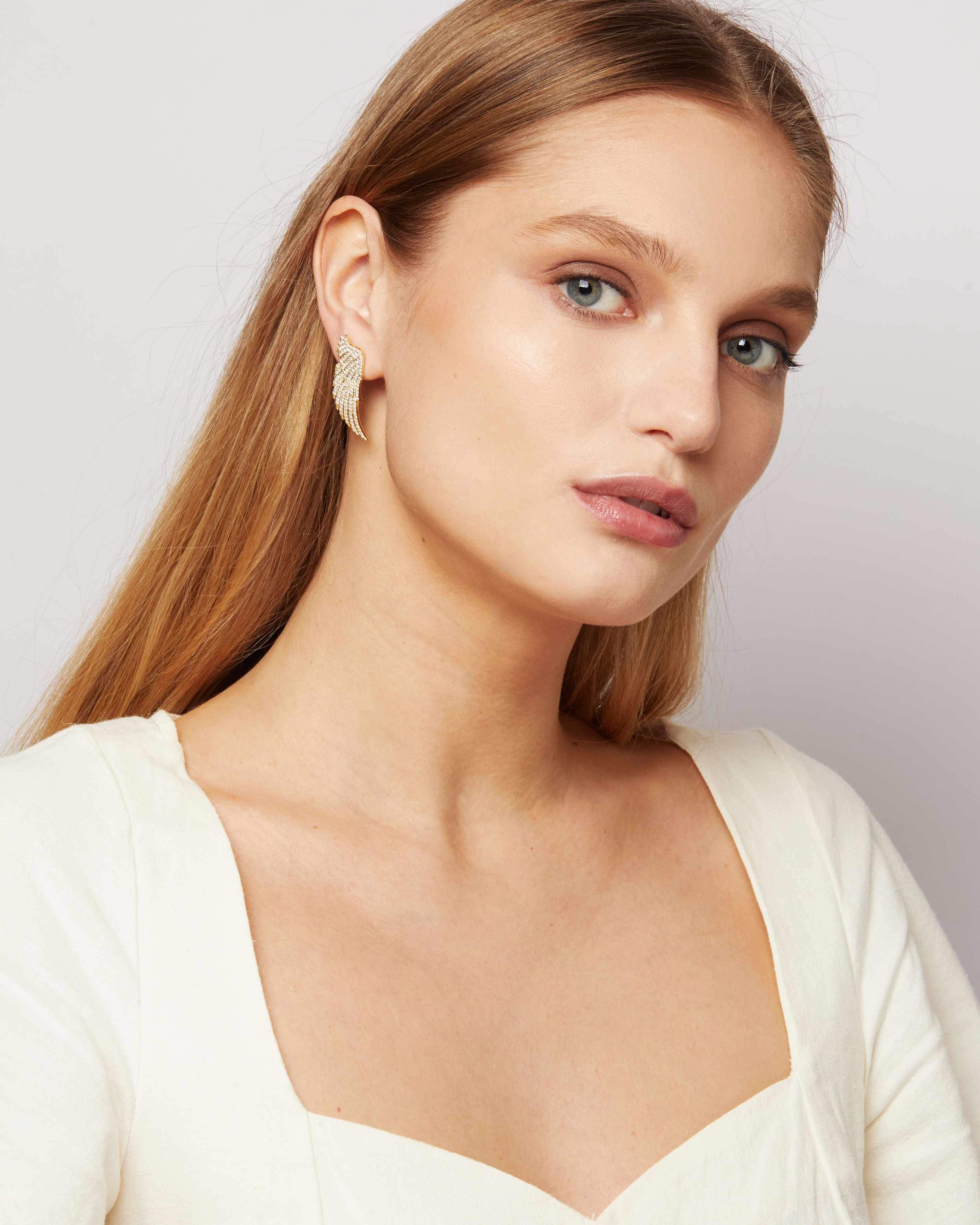 Angels like you might not always show their wings, but with the Angelic Little Wing Earrings, you can add a cherubic finish to any outfit. A simple pair of jeans and a blouse become something so much more with these stunning push-back earrings shaped into delicate wings that extend down below the lobe. Made with 14k gold plating over authentic sterling silver, these wings dazzle with clear diamonettes, making them the most angelic accessory you could ever wear.