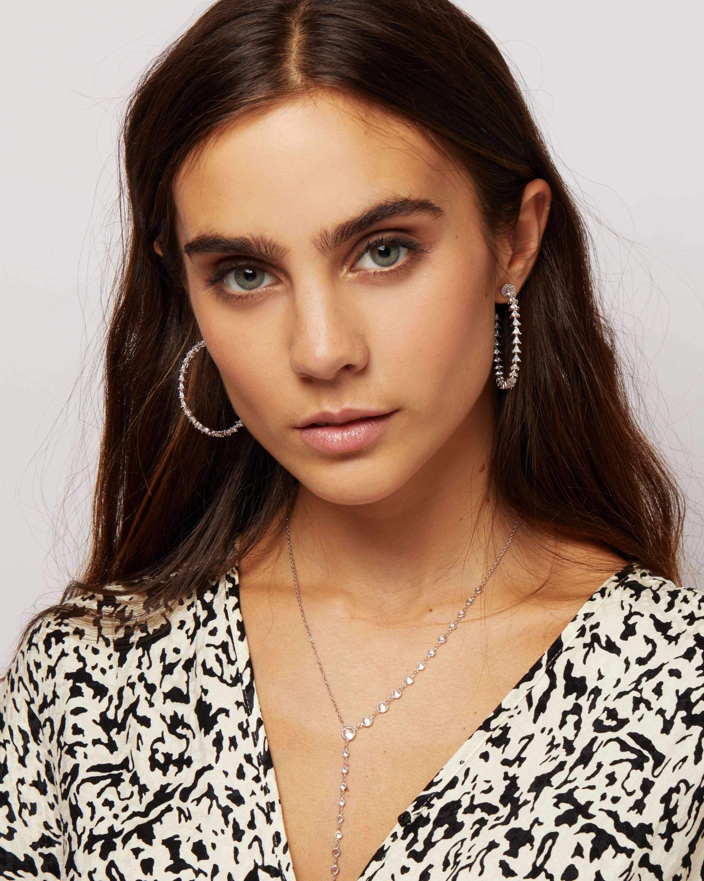 Impeccable sparkle and shine are yours to captivate every room you walk into with Sally Trillion Hoop Earrings. These pushback-style hoops of platinum plating over brass feature a glamorous design of triangle-cut clear diamonettes from front to back. The unique and brilliant style makes for an extravagant look for any night out on the town, one that will add pizzazz to dresses and add that final touch to accessorize your favorite evening wear. Achieve opulence with these spectacular earrings that will make you look like a trillion dollars!
