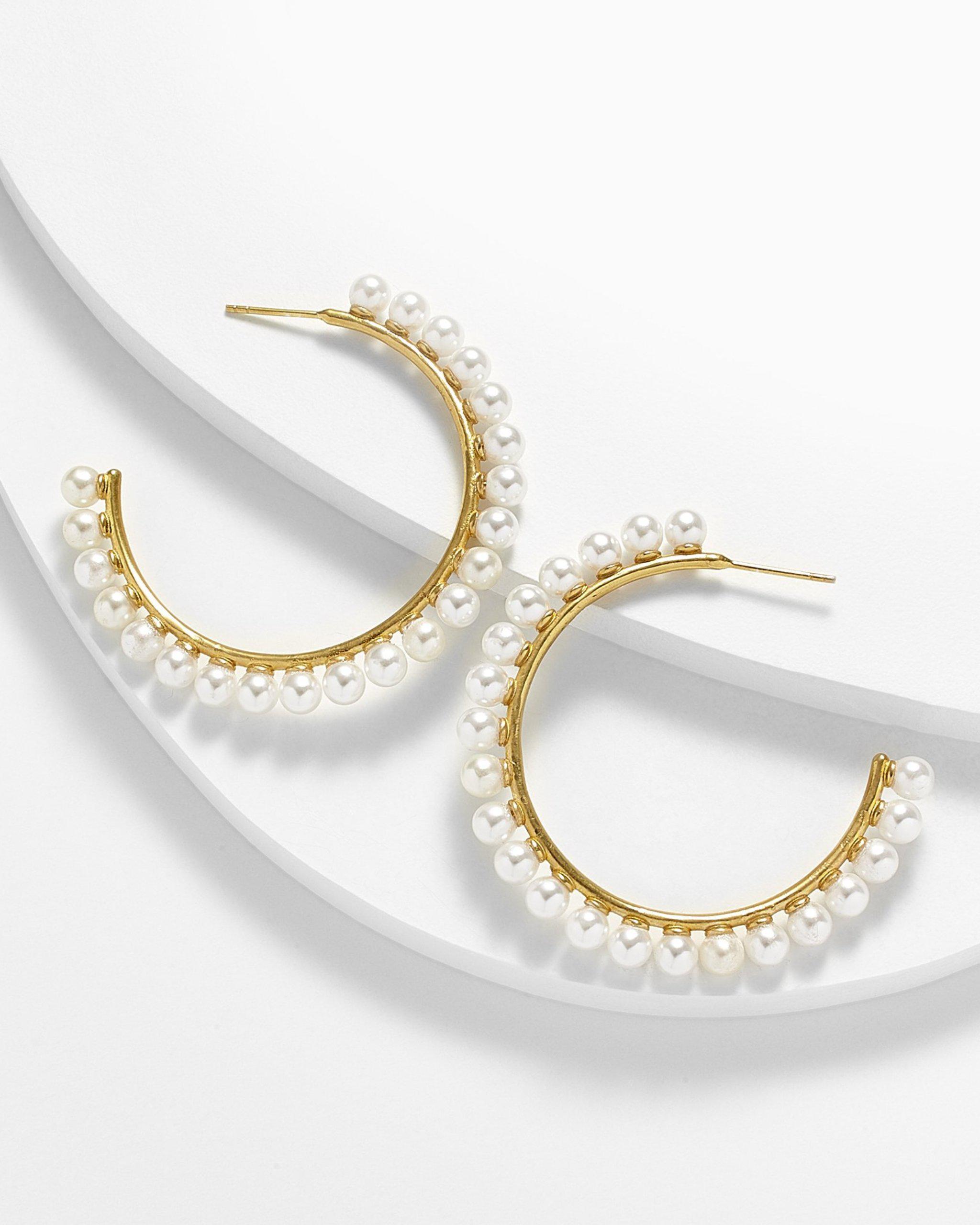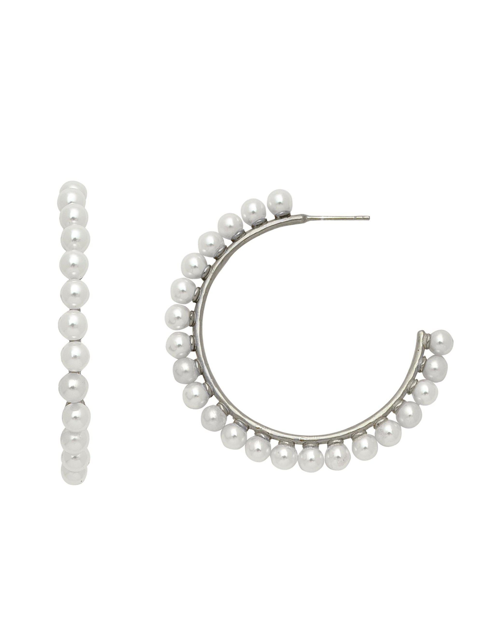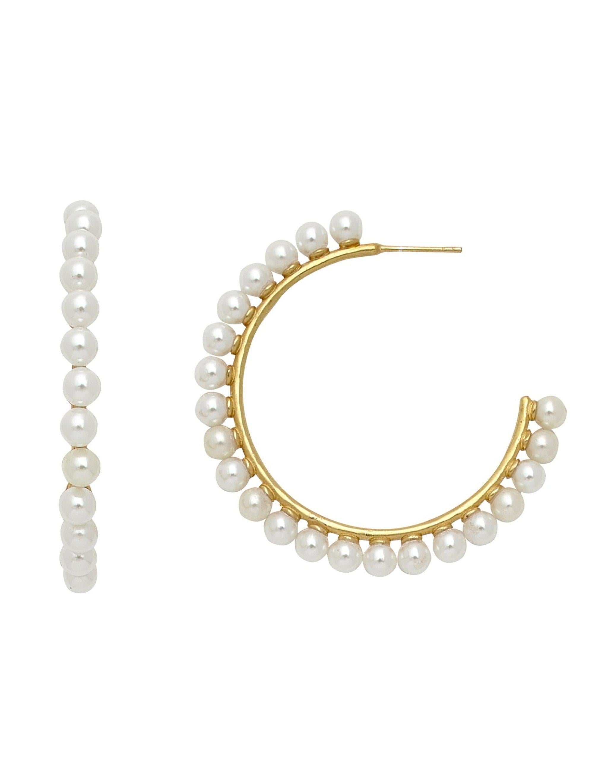 Pearls are always a classy choice, one that adds a demure and innocent accentuation to everything from brunch ensembles and elegant dinners to business attire. The Kendall Pearl Medium Hoop Earrings are a must-have pair, for they can do so well to round out your style everywhere you go. These pushback-style hoops measure at 2 inches in diameter with 14k gold-plated sterling silver. Covering the entire surface are smooth and polished pearls, perfect for completing your most notable looks. Let them be the finishing touch you need for every occasion!